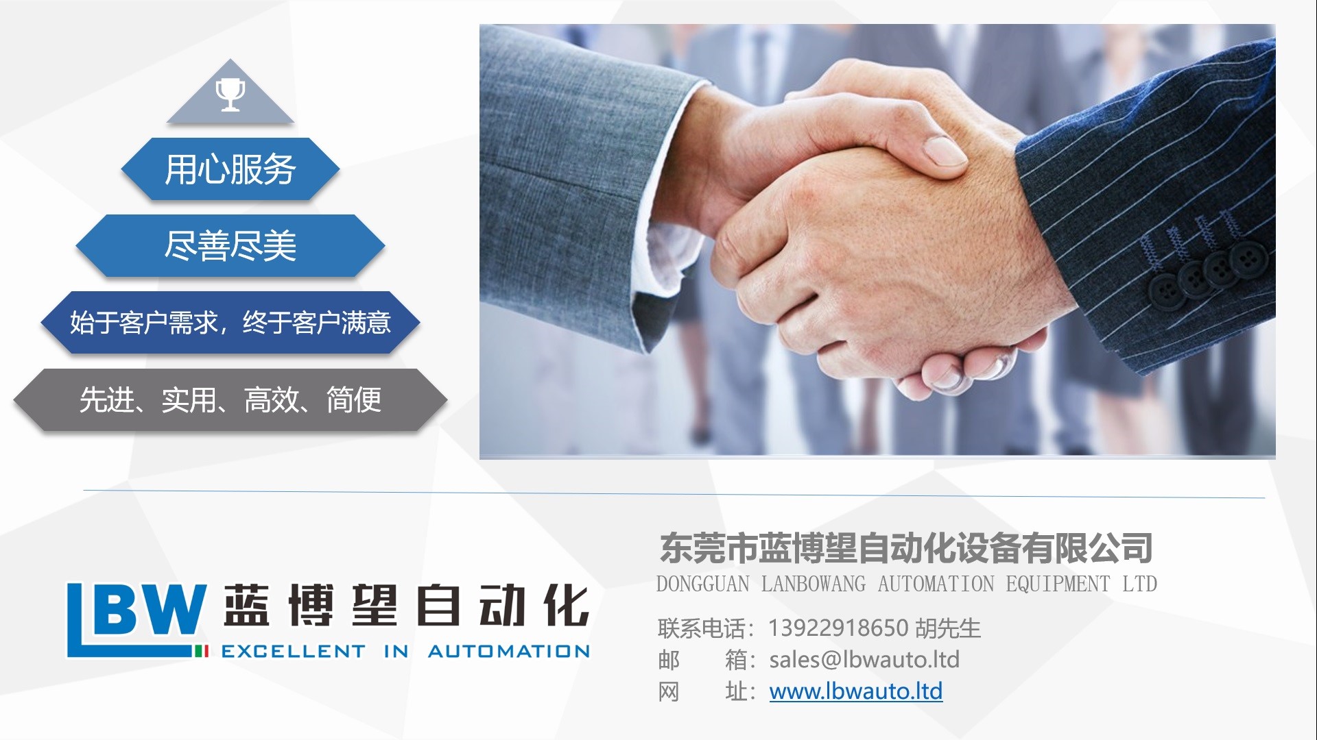 東莞市藍(lán)博望自動(dòng)化設(shè)備有限公司 是一家專業(yè)從事自動(dòng)化機(jī)械設(shè)備研發(fā)、制造、銷售服務(wù)于一體的自動(dòng)化設(shè)備生產(chǎn)商與解決方案提供商,公司力爭以創(chuàng)新、求實(shí)、團(tuán)結(jié)、奮進(jìn)為企業(yè)精神,以誠信求發(fā)展,以質(zhì)量求生存的經(jīng)營理念,為顧客提供優(yōu)質(zhì)、高效、低耗、可靠耐用的產(chǎn)品與解決方案!公司自成立以來,始終堅(jiān)持以先進(jìn)的技術(shù)科學(xué)的管理,精益求精的產(chǎn)品品質(zhì)致力于廣大客戶服務(wù)。