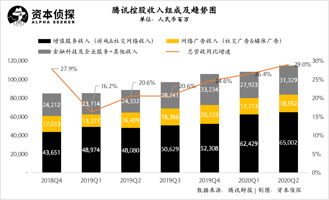 2020年二季度,騰訊增值服務(wù)業(yè)務(wù)的收入同比增長(zhǎng)35%至人民幣650.02億元。
