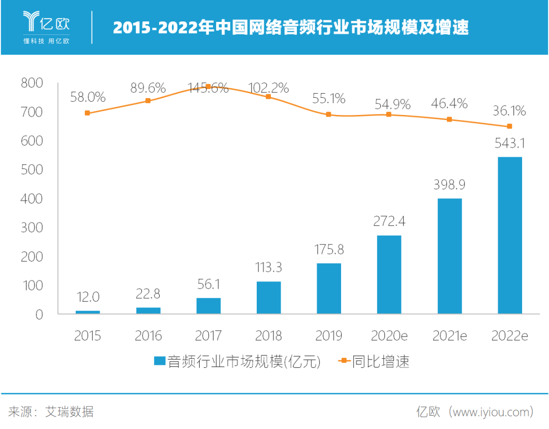 《中國網(wǎng)絡(luò)音頻行業(yè)研究報(bào)告》預(yù)計(jì)2020年網(wǎng)絡(luò)音頻行業(yè)市場規(guī)模達(dá)272.4億元,用戶規(guī)模將達(dá)5.42億。隨著在線音頻內(nèi)容的進(jìn)一步開放,以及用戶場景需求得到進(jìn)一步挖掘,市場有望保持穩(wěn)定快速增長態(tài)勢(shì)。