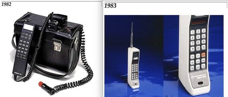 這臺機器是全球的第一臺真正的手機,這也是全球第一次“真正的手機通話”——當時歐美國家雖然有移動電話,但全像臺式電腦一樣笨重(下圖左)。10 年后,這臺名叫 DynaTAC 的手機(下圖右)正式上市,這也是第一代的移動通訊系統(tǒng)——1G 制式的正式登場。