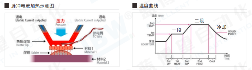 原理:焊接時對焊接部位加壓狀態(tài)下,迅速進行加熱而后快速冷卻,可防止結(jié)合部的浮起、虛焊, 對溫度時間等參數(shù)加以高精度地控制,使焊接具有良好的重復(fù)性,實現(xiàn)高品質(zhì)的生產(chǎn)。